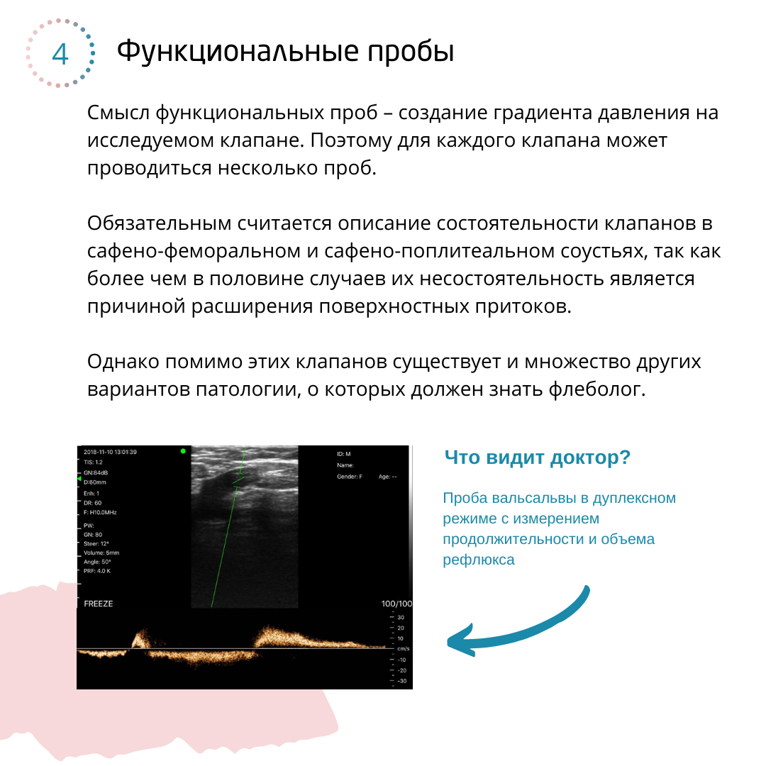 Смысл функциональных проб – создание градиента давления на исследуемом клапане. Поэтому для каждого клапана может проводиться несколько проб. Обязательным считается описание состоятельности клапанов в сафено-феморальном и сафено-поплитеальном соустьях (в проекции паховой и подколенной складки соответственно), так как более чем в половине случаев их несостоятельность является причиной расширения поверхностных притоков. Однако помимо этих клапанов существует и множество других вариантов патологии, о которых должен знать флеболог.